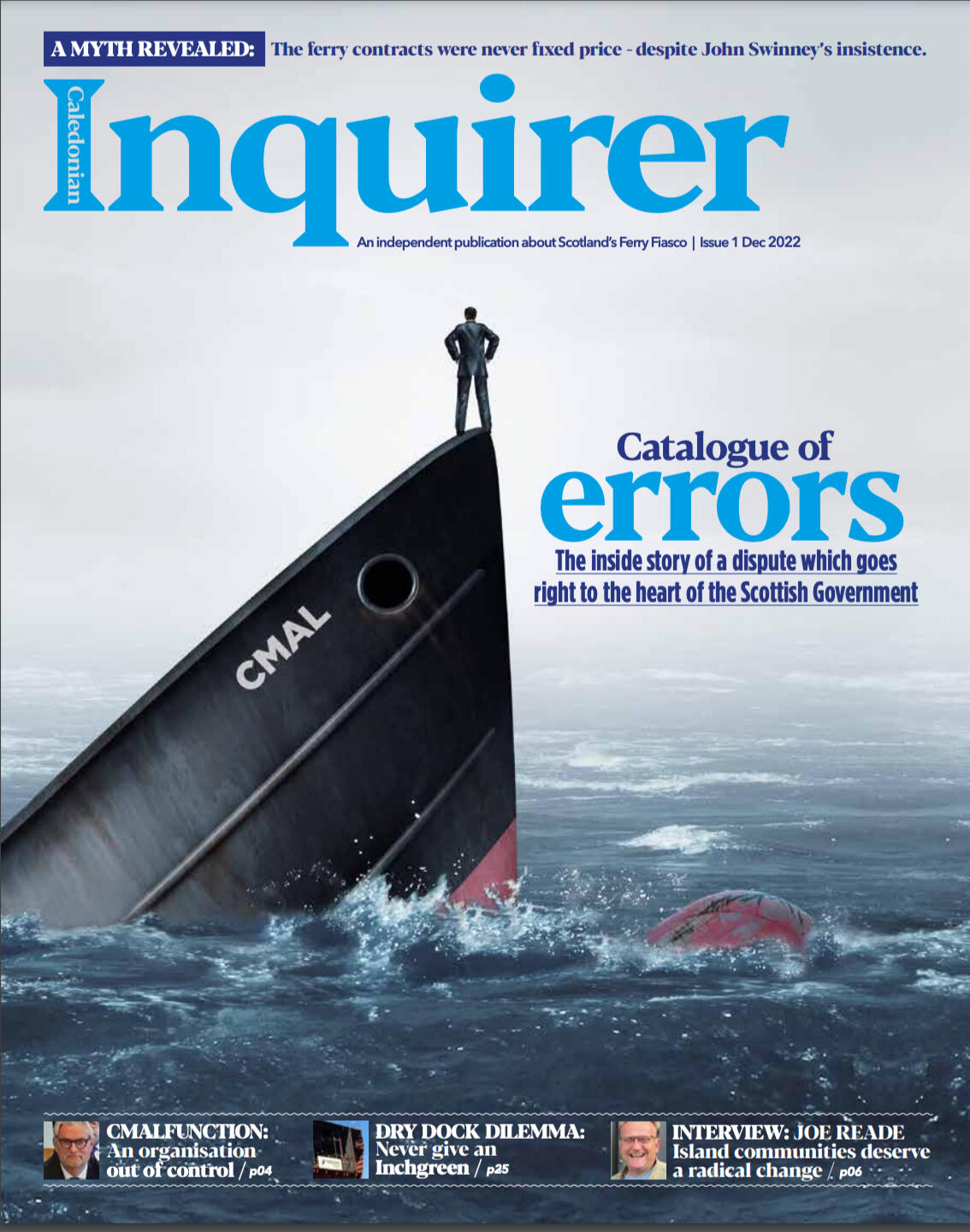 An independent publication about Scotland's Ferry Fiasco. A 32-page colour newspaper featuring views and interviews with communities impacted by the abysmal decisions made by Transport Scotland and compounded by the Scottish Government. And the view of several politicians about what can and should be done to resolve this fiasco.